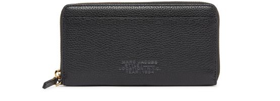 The Marc Jacobs Continental Wristlet wallet is a stylish accessory crafted from grained leather. It features a convenient leather handle for easy carrying. The front showcases the brand's logo and a practical patch pocket. Inside, you'll find multiple card compartments and zippered pockets for change and coins, secured with a zipper fastening.