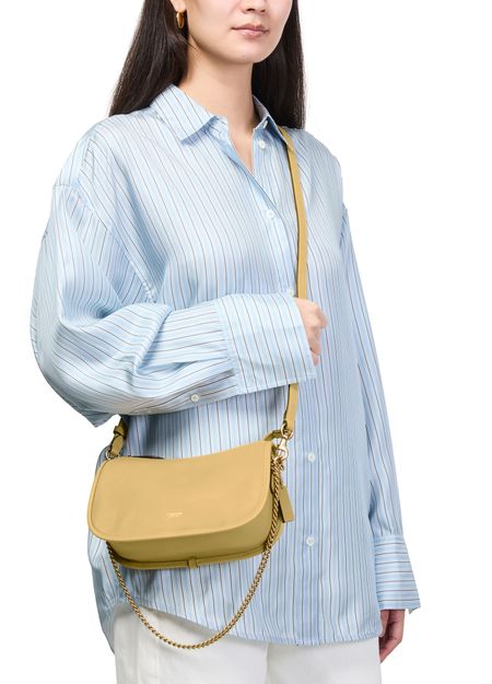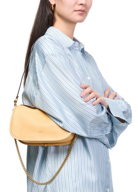 Reveal Coach's Waverly shoulder bag, crafted from smooth leather with a gold finish. The chain strap and single handle offer versatile carrying options, while the decorative label with embossed Coach logo and visible topstitching highlight refined craftsmanship. A zipper closure ensures your essentials stay secure in style.