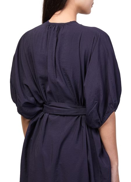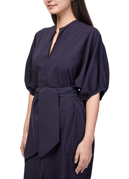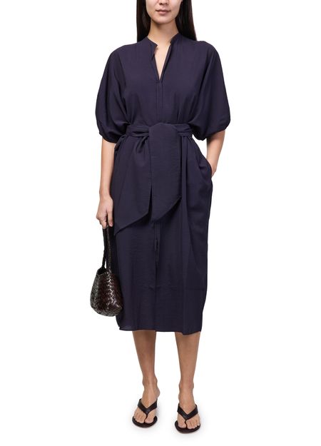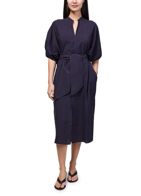Reveal Soeur's alger midi dress, a refined shirt dress featuring a V-neck and dolman sleeves for a fluid silhouette. The mandarin collar and visible stitching add modern structure, while side pockets and a front slit offer both practicality and style—perfect for versatile, contemporary wardrobes.