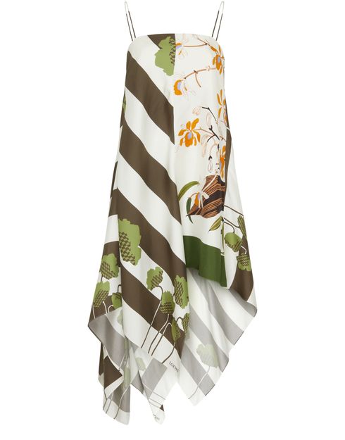 Loewe's Asymmetric dress features a floral print and striped print, with a rectangular neckline and an asymmetric cut for a unique and modern look.
