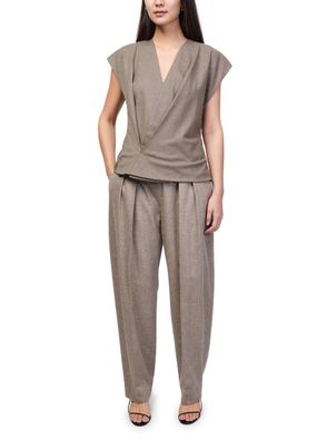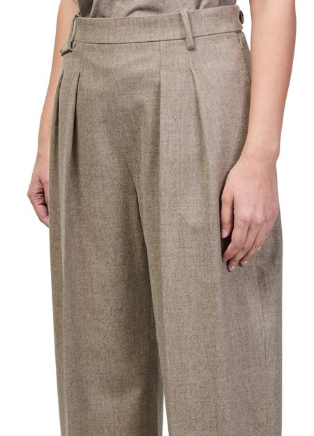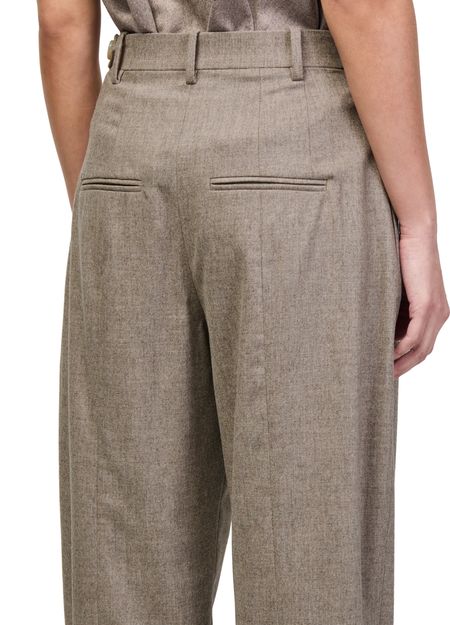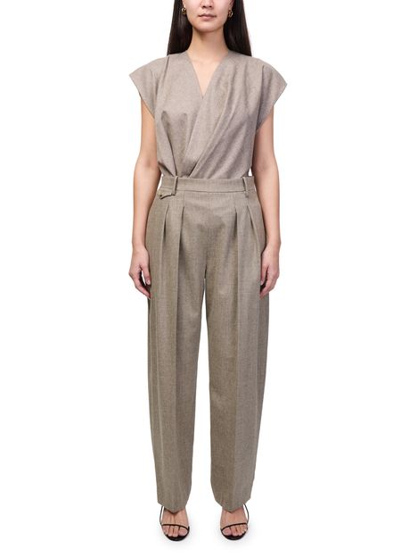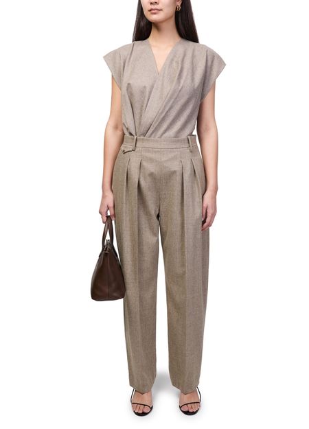 Reveal Khaite's Dugan pants, crafted with a belted waist and front pleating for a refined silhouette. The ankle-length cut, visible stitching, and side pockets offer both sophistication and practicality. A concealed closure and belt loops complete these formal trousers, perfect for elevating any modern wardrobe.
