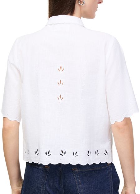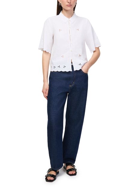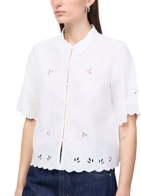 Reveal Skall Studio's fleurie shirt, featuring a refined round neck and short sleeves for a fresh, modern silhouette. The front buttoned closure adds a polished touch, while the delicate floral pattern makes this top a versatile choice for both casual and elevated ensembles.