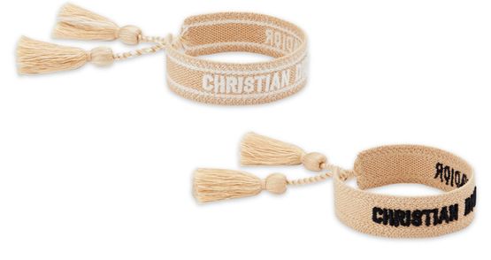 Description : CHRISTIAN DIOR J'ADIOR' signature embroidered at the front, slide fastening with tassels, this set contains two bracelets, adjustable length : 14 - 23 cm around.