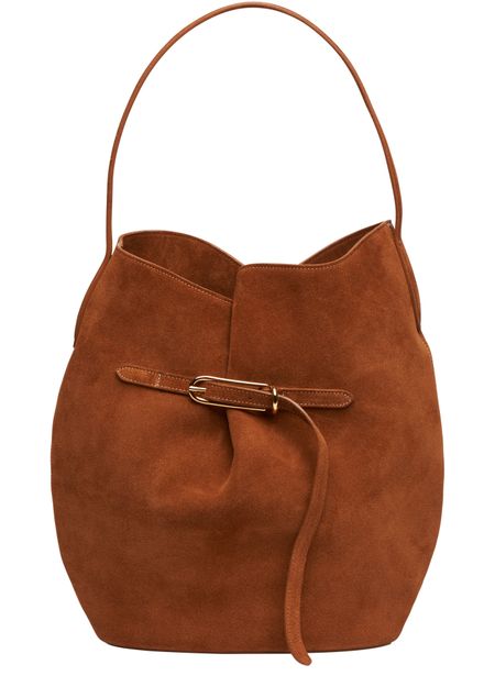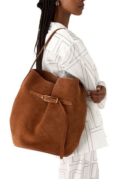 Reveal Liffner's large belted bucket bag, a modern statement with a single handle and visible topstitching. The spacious interior compartment and refined metal finish blend practicality with contemporary flair, making this shoulder bag an essential for those who appreciate elevated design and everyday versatility.