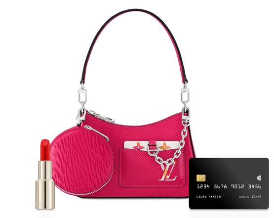 The Marelllini handbag is made from grained Epi leather with smooth cowhide-leather trim. There’s a removable round coin purse, also in Epi leather, connected to the handle mount. Inside the exterior front pocket is a removable mirror in Monogram Tiles canvas, hooked to the bag by a stylish silver-color chain.