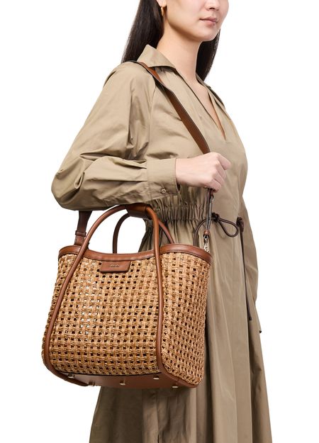 Reveal Max Mara's Marine basket bag, a statement piece with double handles and a wide, adjustable strap for versatile styling. The detachable interior purse and keyring add practical flair, while the metallic logo and gold finish elevate its modern appeal. Snap-button fastening secures your essentials in style.