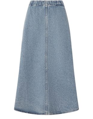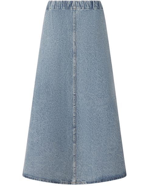 A fluid, Midi circle denim skirt is made in washed-down Crinkled Indigo from 80% organic cotton and 20% recycled cotton. With conscious construction and fabrication, it balances playful femininity with responsible innovation.