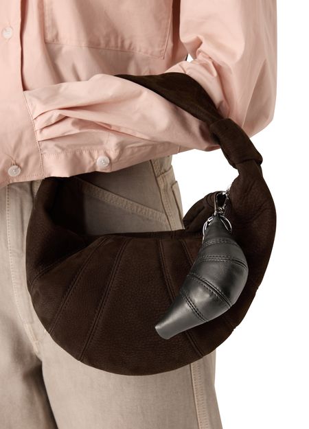 Reveal Lemaire's mini croissant keyring, crafted with topstitched edges and a padded texture for a refined touch. The silver finish elevates its modern appeal, making it a versatile accent for keys or as a stylish bag charm. A distinctive accessory that seamlessly blends function and design.