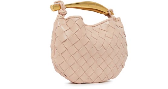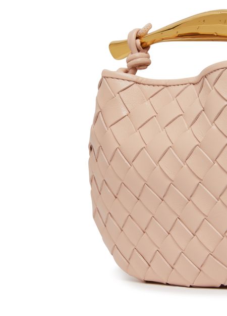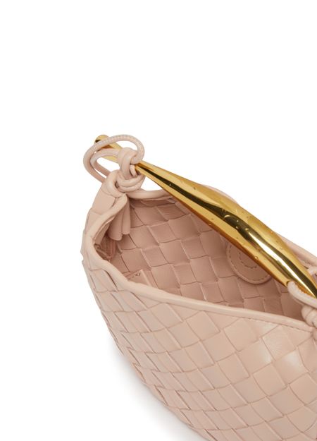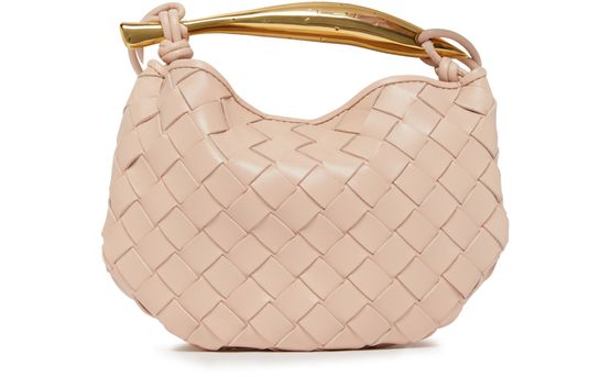 Bottega Veneta's Mini Sardine Bag is crafted from Intrecciato leather, featuring a distinctive metal handle and sliding shoulder strap with metal ring and bow. The bag is secured with a magnetic closure, and the metal handle is individually crafted by artisans, giving each piece a unique touch with nuances and engraved marks.