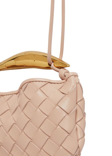• Description : Intrecciato leather, metal handle, sliding shoulder strap with metal ring and bow, magnetic closure, the metal handle is crafted by artisans and features nuances and .