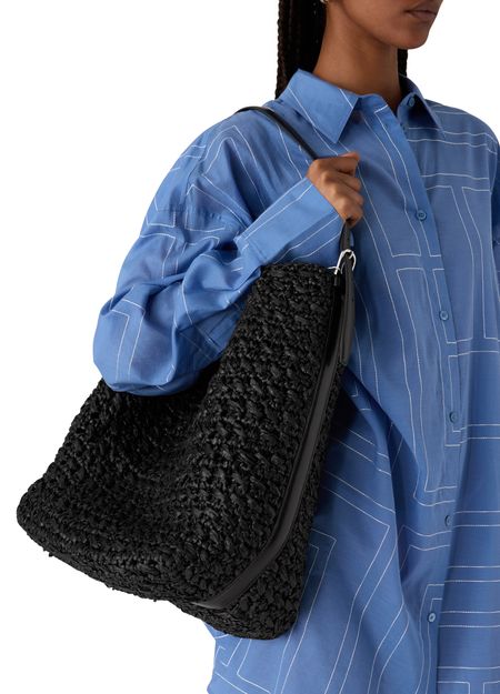 Reveal Toteme's Belted raffia tote bag, designed with a single handle and a spacious interior compartment. The silver finish adds a refined touch, making this tote a standout accessory for modern wardrobes. Experience effortless style and practical elegance in every detail.
