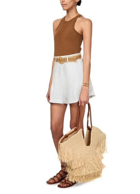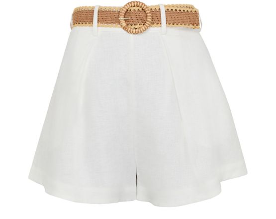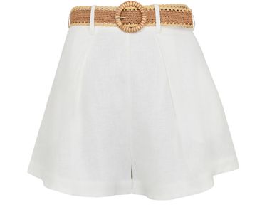 Unveil the Zimmermann Rhiannon Tuck shorts, crafted with a high-waisted fit and detailed with belt loops. These high-rise shorts offer a sleek silhouette, perfect for warm-weather styling. Whether for a casual outing or a chic ensemble, they embody sophistication and versatility.