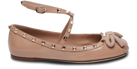Rockstud ballet flats are an elegant pair crafted from patent leather, showcasing a sleek shape and adorned with a front bow. They feature the iconic Rockstud decorative studs in gold finish, along with a buckled ankle strap. The flats boast a very thin sole and a flat heel for added comfort and style.