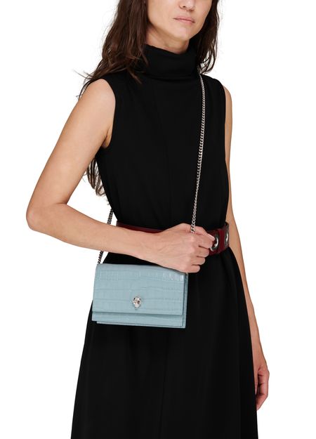 Alexander McQueen's Flap closure small skull bag features a sleek and sophisticated design with a chain strap and silver closure. This luxurious accessory exudes edgy elegance and is perfect for adding a touch of glamour to any ensemble. The flap closure offers both style and security for your essentials.