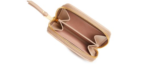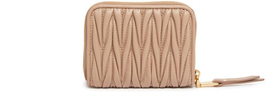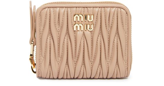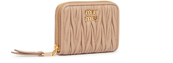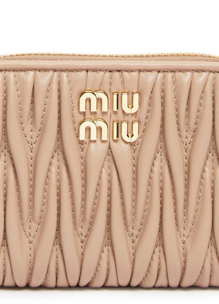 Miu Miu's zipped wallet features a padded texture with visible topstitching and a front logo in gold letters. It includes interior slots for cards, an interior pocket, and a secure zipper closure. This elegant and practical accessory is perfect for keeping your essentials organized in style.