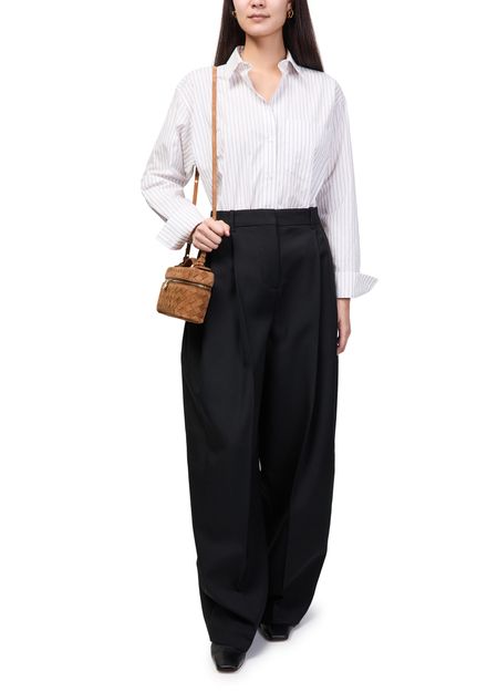 Reveal Bottega Veneta's Bang Bang vanity case, crafted in sumptuous suede with the iconic Intrecciato weaving technique. A single handle and thin, adjustable strap offer versatile carrying, while gold-finish hardware and visible stitching add refined detail. The spacious interior compartment ensures effortless organization.