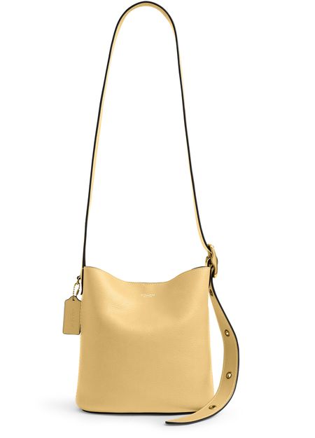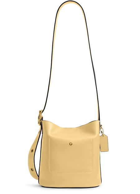 Reveal Coach's Bleeker 21 bucket bag, a modern statement with a decorative label featuring the embossed Coach logo. The thin, adjustable strap and visible stitching add refined detail, while the gold-finish hardware and front logo in gold letters elevate its sophisticated appeal for everyday versatility.