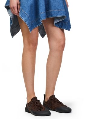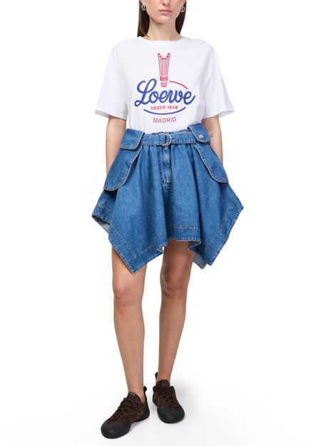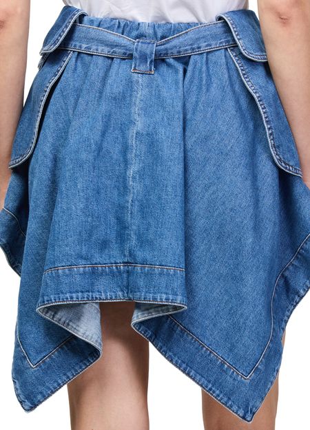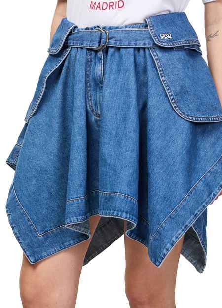 Reveal Loewe's denim cargo skirt, a modern mini length piece defined by its belted waist and patch pockets. The front slit and visible stitching add a dynamic edge, while topstitched edges and an asymmetric cut create a striking silhouette perfect for versatile, day-to-night styling.