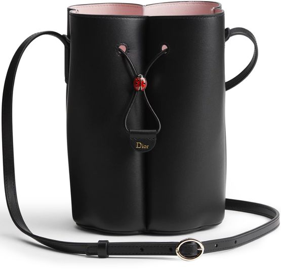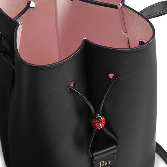 Introducing Dior's Petit Trèfle Mini Bucket Bag, featuring a chic drawstring closure with a Dior-signed leather tab and an enameled metal ladybug slider. This elegant piece comes with an adjustable leather strap, perfect for any occasion, and includes a protective dust bag for safekeeping.
