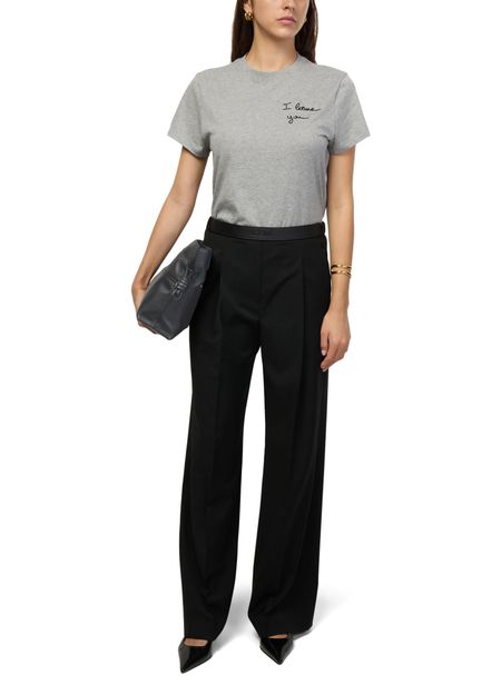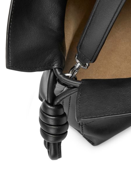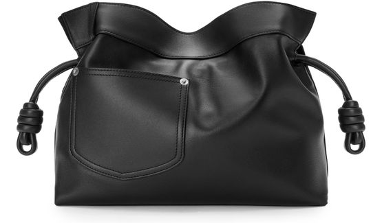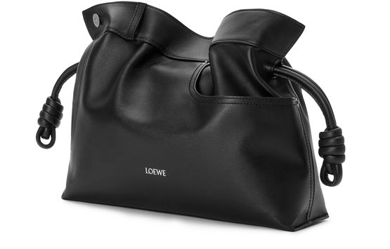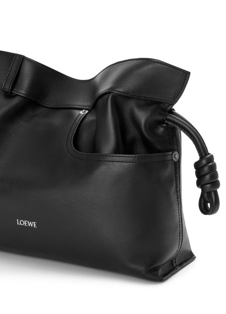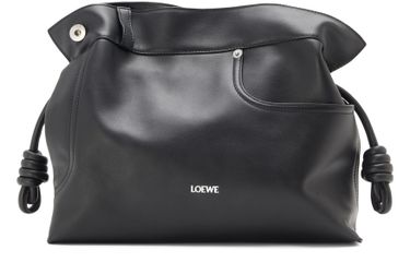 Reveal Loewe's Panta medium Flamenco clutch, crafted from smooth leather with visible stitching and a refined silver logo on the front. The drawstring closure and dual pockets blend modern design with practical elegance, while silver finishes add a sophisticated touch to this statement piece.