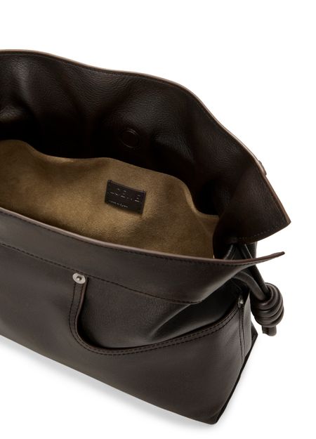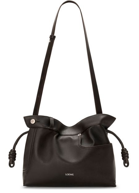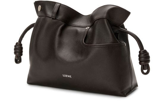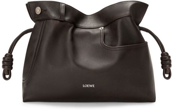 Reveal Loewe's Panta medium Flamenco clutch, crafted from smooth leather with visible stitching and a refined silver logo on the front. The drawstring closure and dual pockets blend modern design with practical elegance, while silver finishes add a sophisticated touch to this statement piece.