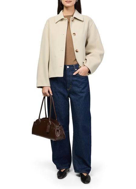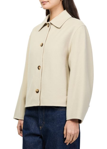 Reveal Soeur's Gyoda woolen cropped coat, a refined short silhouette with a classic collar and long sleeves. Crafted from premium wool, its button fastening adds timeless appeal. This versatile piece transitions effortlessly from day to evening, making it a standout addition to any modern wardrobe.