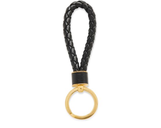 Bottega Veneta's key ring features a luxurious carry handle and is crafted using the iconic Intrecciato weaving technique. The gold finish adds a touch of elegance to this practical accessory, which is designed to be worn in the hand. This stylish key ring is a perfect blend of functionality and sophistication.