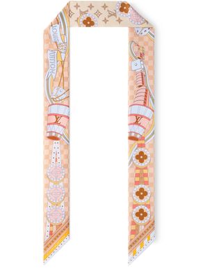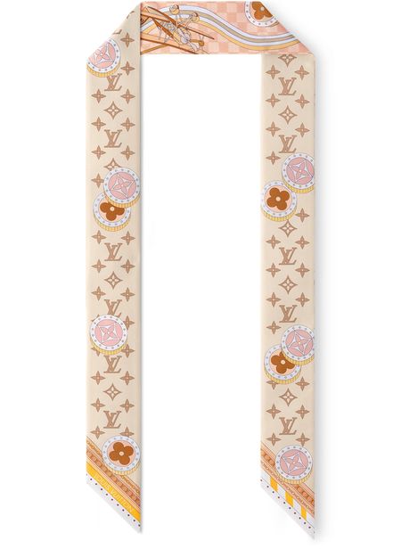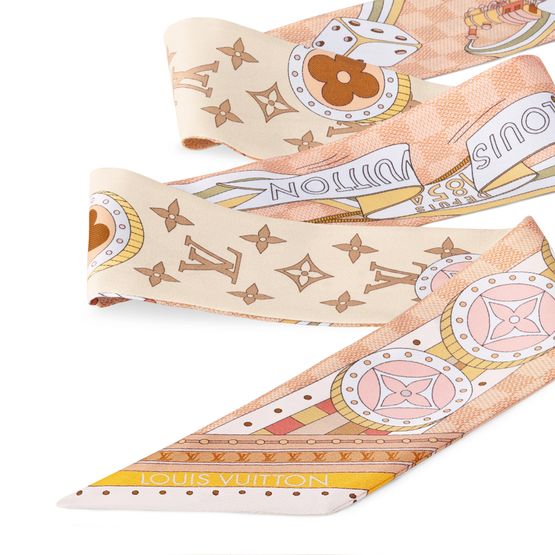 The playful design of the Jeu De Voyage BB bandeau was inspired by the pleasure of games. Printed on rich silk, it mixes backgammon elements like dice and chips with the classic Damier motif, recalling the House’s heritage. A refined Monogram pattern on the reverse side adds a discreet extra signature.