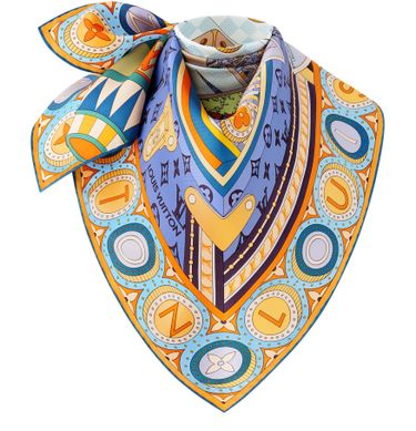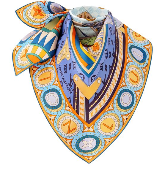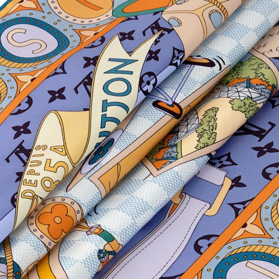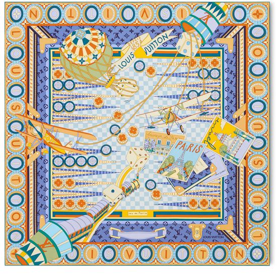 The distinctive Jeu De Voyage square has all the qualities of a timeless, iconic accessory. Printed on sumptuous silk, its finely detailed design features a backgammon theme mixed with images evoking the House’s travel heritage: a trunk, a hot air balloon, a train, airplanes… The Monogram and Damier motifs in the background add an extra signature touch.