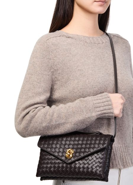 Reveal Bottega Veneta's crossbody bag, a testament to refined artistry with its signature Intrecciato weaving technique. The sleek single handle and thin strap offer versatile carrying, while the flap closure and gold finish add a polished touch. Experience functional elegance with a discreet back pocket and leather interior.