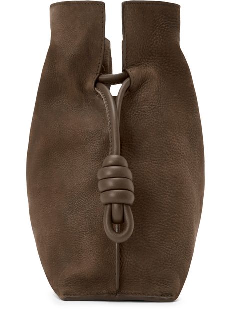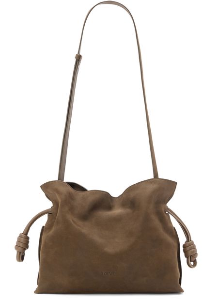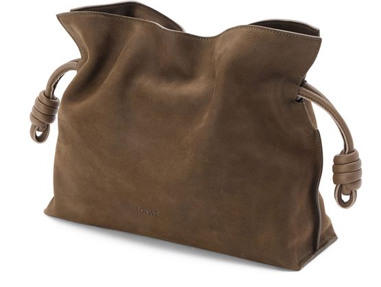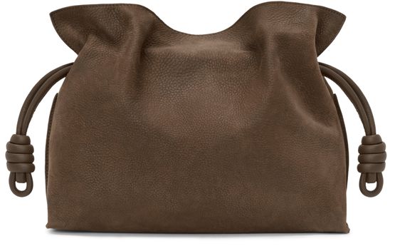 Reveal Loewe's medium Flamenco clutch in grained nubuck, a statement piece defined by its padded texture and twisted details. The single handle and drawstring closure offer both style and practicality, while the embossed logo on the front adds a signature touch. Perfect for elevating any modern ensemble.