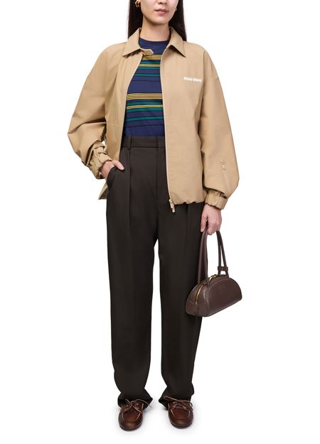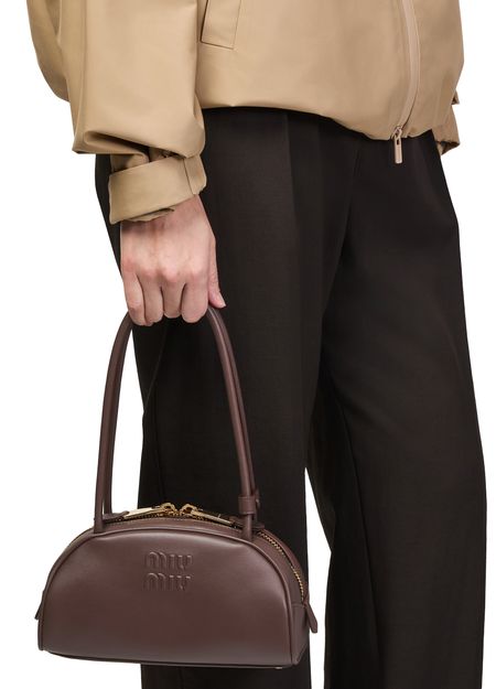 Reveal Miu Miu's bowling mini hand-held bag, crafted from smooth leather with a refined gold finish. The printed Miu Miu lettering and visible topstitching highlight its signature style, while double handles and a thin strap offer versatile carrying. A zippered single compartment ensures practical elegance.