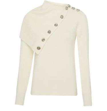 Paco Rabanne's Mockneck sweater showcases a long-sleeved silhouette with a regular length, perfect for layering. Its crew neck design adds a touch of sophistication, while the shoulder buttoned closure offers unique detail. Featuring a front logo and a logo at the back label, this piece embodies modern elegance and style.