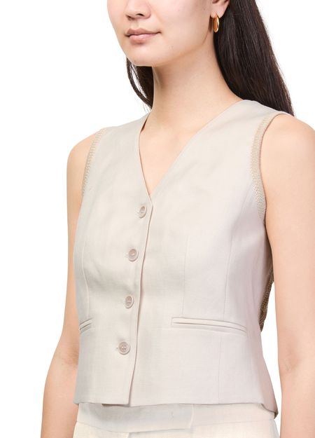 Reveal Max Mara's Bermuda tailored vest, a modern ensemble featuring a short, collarless, and sleeveless silhouette. Button fastening and two front pockets add refined practicality. The crisp tailoring and versatile design make this set ideal for both polished daytime looks and elevated evening occasions.
