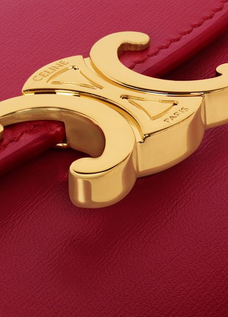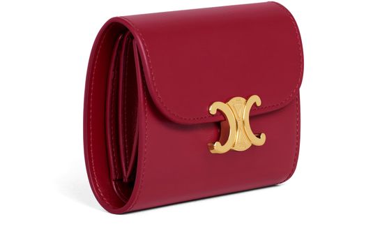 Celine's Triomphe small flap wallet in shiny calfskin is a luxurious accessory that embodies elegance. With its gold finishing and a triomphe metallic snap button closure, it offers both style and functionality. Featuring a folded coin pocket, five credit card slots, a note pocket, and a flat pocket, it's perfect for the modern individual.