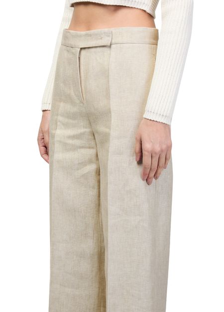 Reveal Max Mara's wide linen pants, crafted with a refined ankle-length silhouette and front pleating for a polished look. The concealed closure and welt pockets add functional elegance, while belt loops and back darts ensure a tailored fit—perfect for elevating both formal and relaxed ensembles.