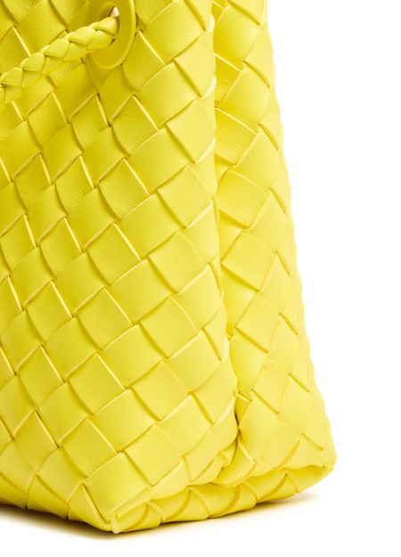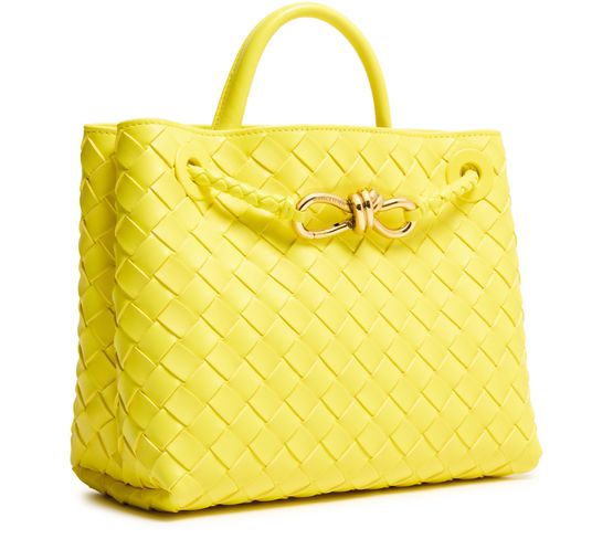 • Description : Smooth leather, intrecciato weaving technique, handle, thin strap, gold finish, hand carried, worn on the shoulder or crossbody.