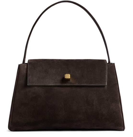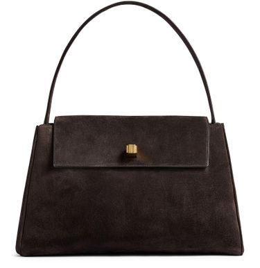 Reveal Khaite's Audrey shoulder bag, crafted from sumptuous suede with a single handle for effortless sophistication. Gold-finish hardware and visible stitching highlight its refined design, while a spacious interior compartment and twist lock closure ensure both style and practicality for modern essentials.