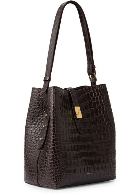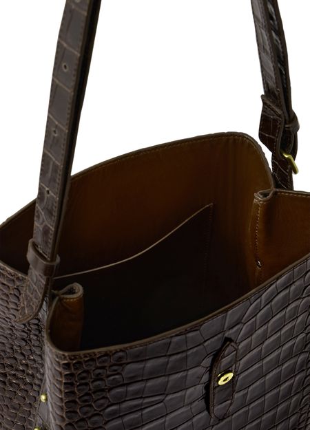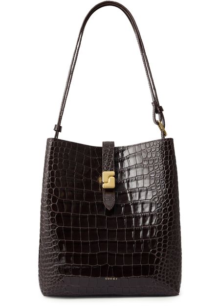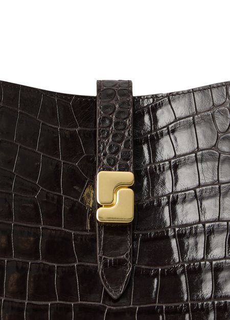Reveal Soeur's Bello shoulder bag, a modern tote with a striking crocodile print and refined single handle. The gold-lettered front logo and visible stitching highlight expert craftsmanship, while the spacious interior and snap-button fastening offer both style and practicality for everyday sophistication.