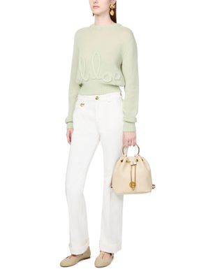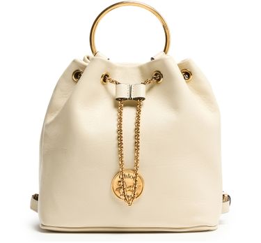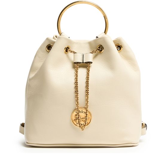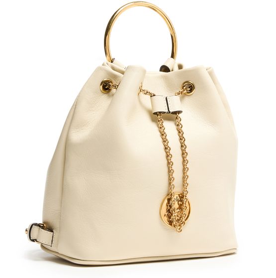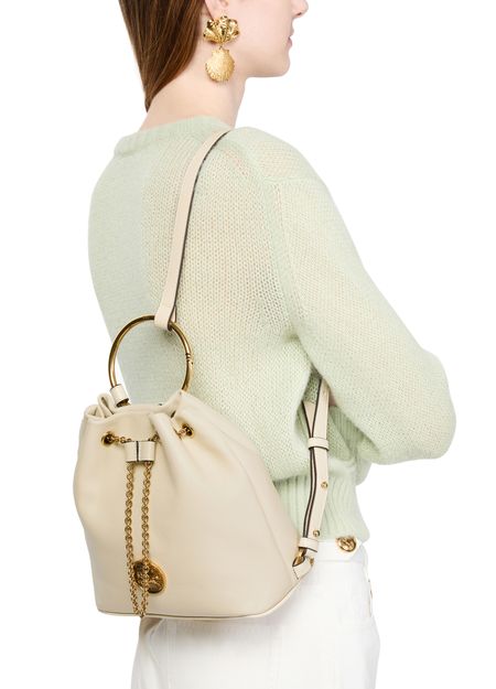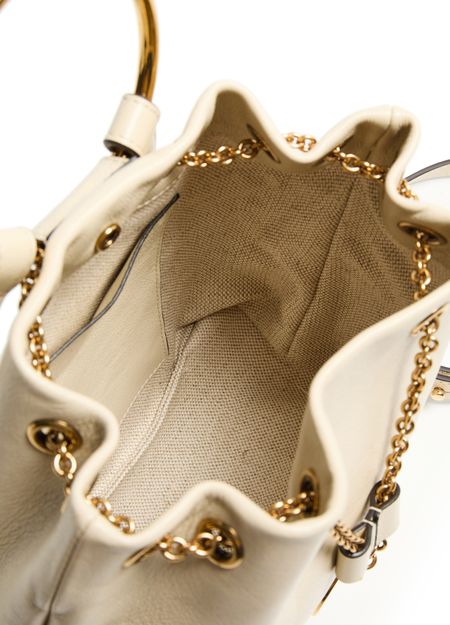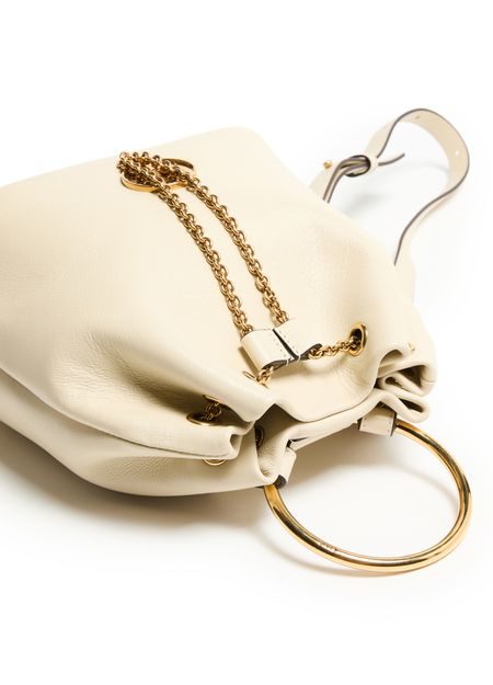 Discover Chloé's Bracelet backpack, a versatile accessory with a drawstring closure and visible topstitching. The engraved front logo and gold finish add elegance, while the single compartment keeps essentials organized. Carry it by hand or on the back using the adjustable and thin strap, complemented by double handles.
