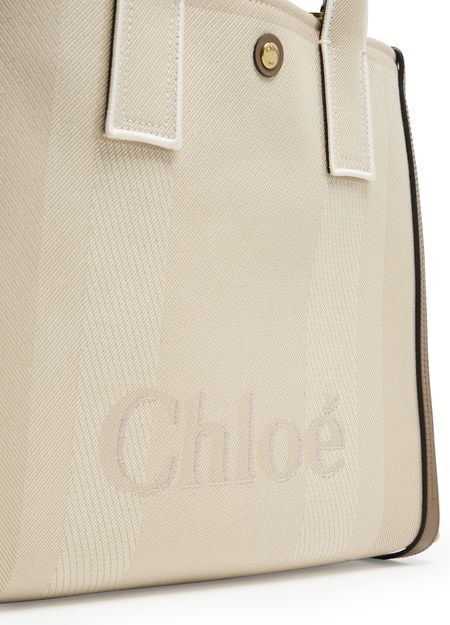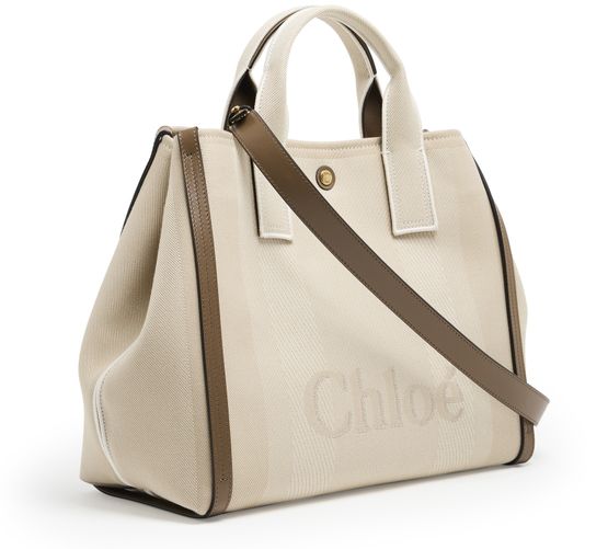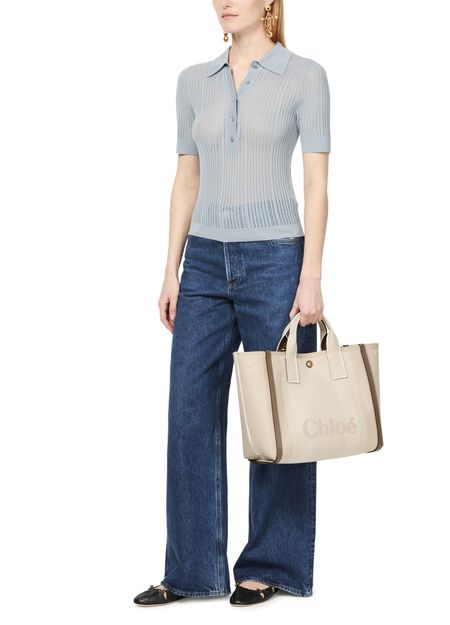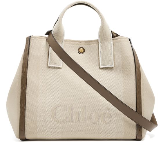Chloé's Carry handbag showcases elegant double handles and a prominent front logo, blending sophistication with practicality. Its visible topstitching adds a touch of detail, while the wide strap allows for versatile styling. Hand carried, worn crossbody, or draped on the shoulder, this bag effortlessly elevates any outfit.