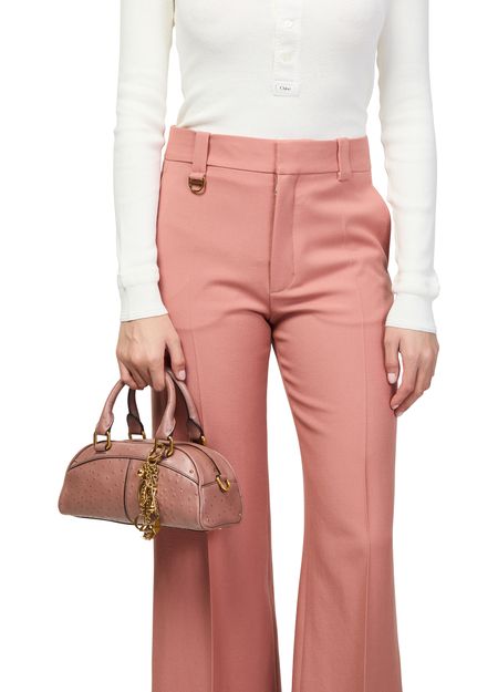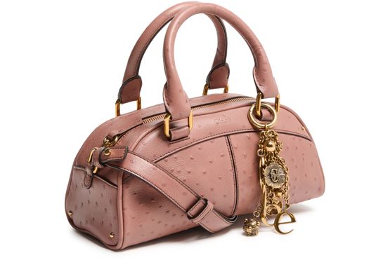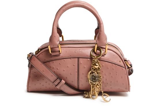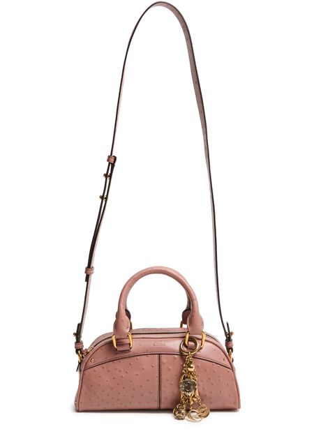 Reveal Chloe's bowling handbag, crafted from grained leather and adorned with gold-tone charms suspended by a delicate chain. The double handles and adjustable, detachable thin strap offer versatile carrying options, while the front logo and gold finish add a refined touch to this modern shoulder and crossbody bag.