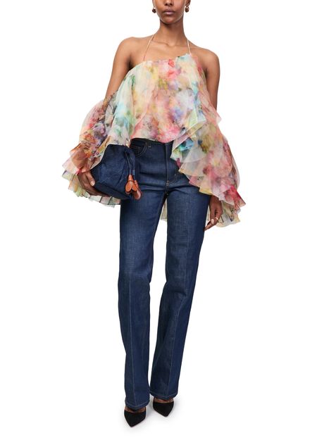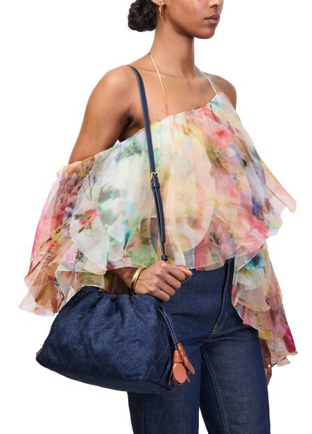 Reveal Zimmermann's Cloud 91 medium clutch, a statement piece defined by its checked pattern and gold finish. The adjustable thin strap and drawstring closure offer both style and practicality, while tassel details and a contrast lining add a refined touch to this modern accessory.