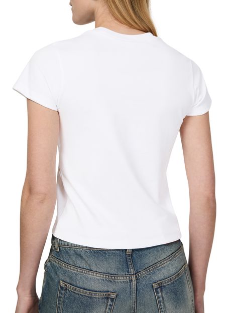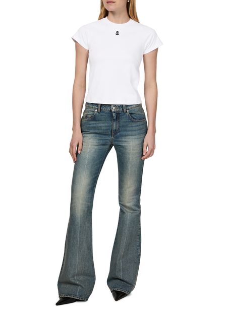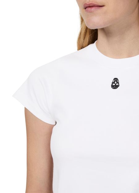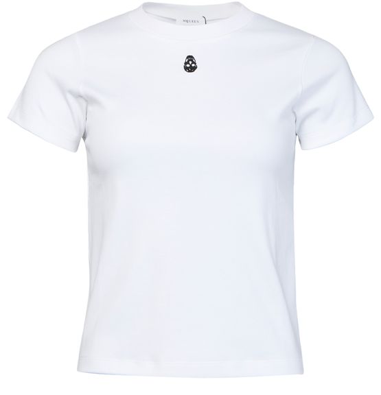 McQueen's Cut And Sew t-shirt showcases a short-sleeved design with a classic crew neck. Its regular length offers a versatile fit, while the visible stitching adds an artistic touch. This t-shirt effortlessly blends contemporary style with comfort, making it a staple for those who appreciate bold fashion statements.