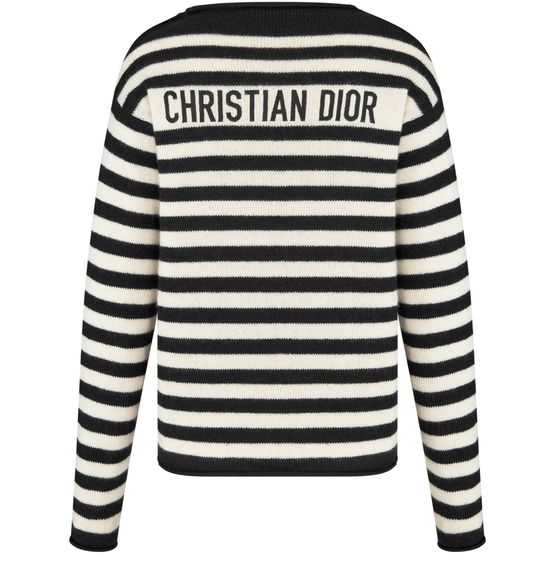 Reveal Dior's Marinière Sweater, adorned with navy blue Christian Dior Paris buttons featuring a gold-finish anchor on the shoulder. Its iconic Christian Dior signature graces the back, embodying elegance. This unlined piece perfectly captures the essence of modern sophistication.