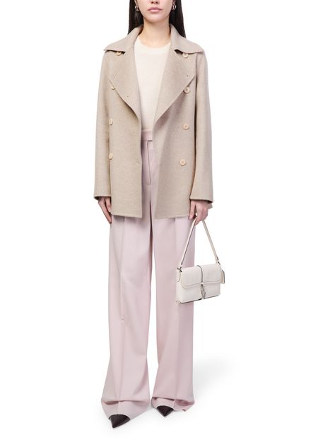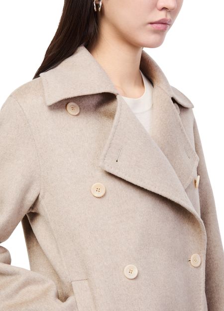 Reveal Max Mara's short double-breasted coat, a refined piece defined by its classic silhouette and tailored collar. Long sleeves and flap pockets add functional elegance, while the structured fit ensures versatility for both day and evening wear. This coat seamlessly blends timeless style with modern sophistication.