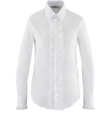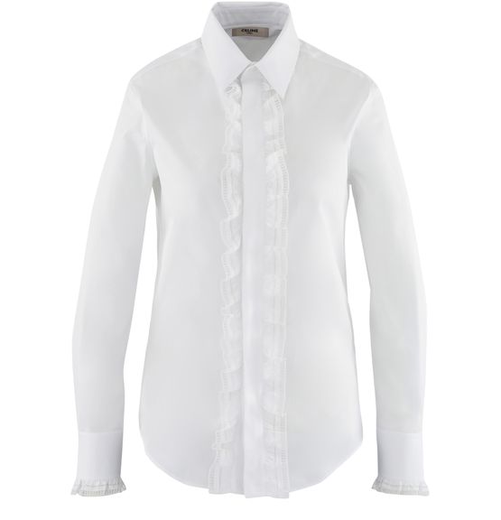 An openwork lace effect at the base of the wrist and an airy frill along the buttoning strip for the embroidered shirt signed with a bohemian look by the Celine house. This sophisticated shirt can be worn with a leather jacket or a blazer and flared jeans.