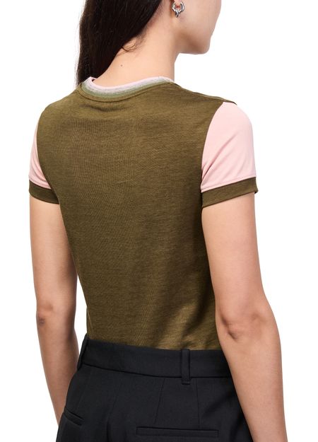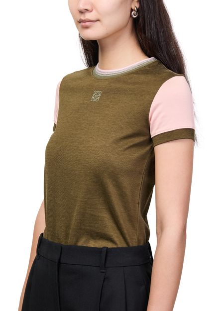 Reveal Loewe's fitted cotton and viscose t-shirt, featuring a crew neck and short sleeves for a sleek silhouette. The front is adorned with an embroidered logo, adding a refined touch. This versatile top pairs effortlessly with both casual and tailored looks, making it a modern wardrobe essential.