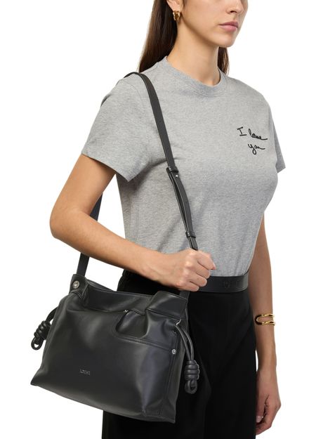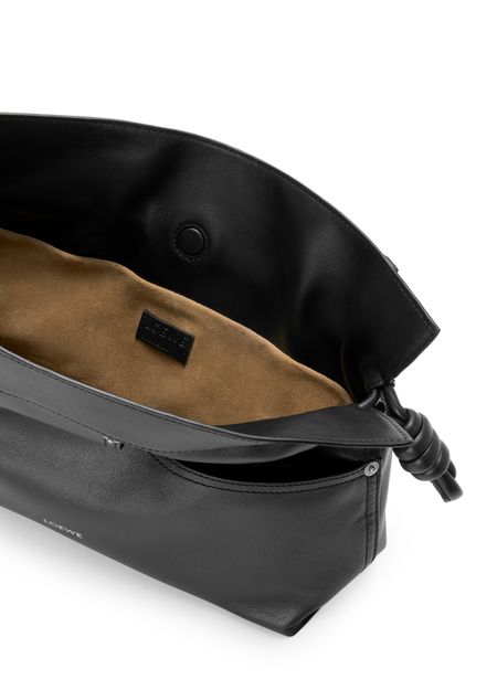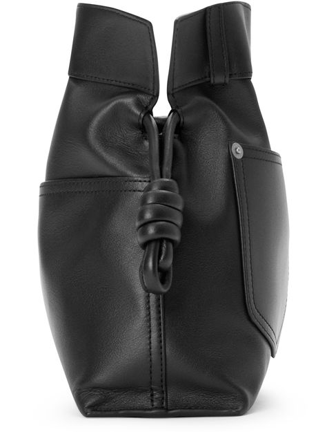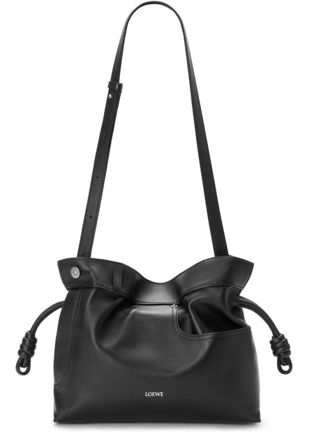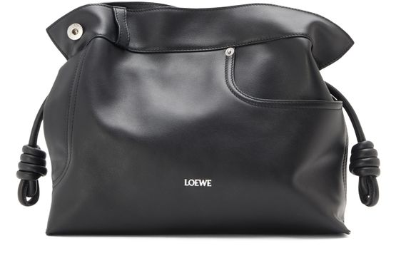 Reveal Loewe's Panta medium Flamenco clutch, crafted from smooth leather with visible stitching and a refined silver logo on the front. The drawstring closure and dual pockets blend modern design with practical elegance, while silver finishes add a sophisticated touch to this statement piece.