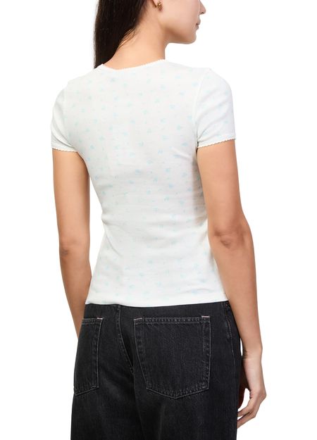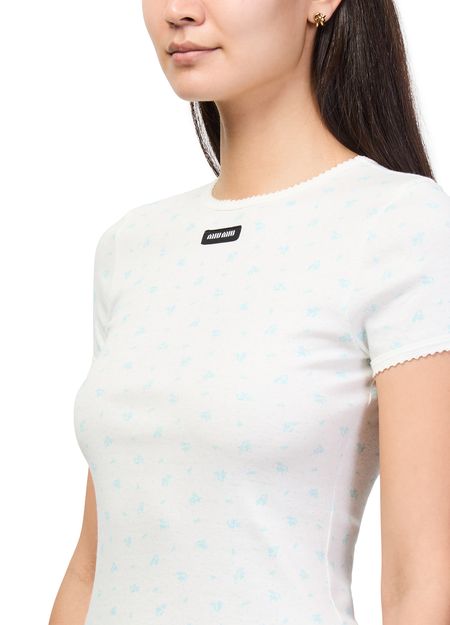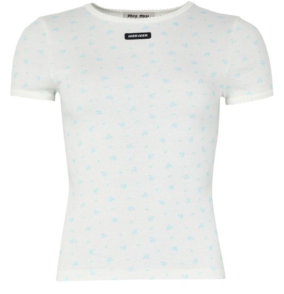 Reveal Miu Miu's floral print t-shirt, a modern top featuring a crew neck and short sleeves. The decorative label with the Miu Miu logo and a vibrant floral pattern on the front add a fresh, expressive touch—perfect for elevating everyday looks with effortless sophistication.